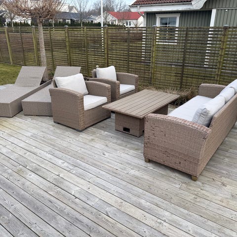 Möblerna är i bra skick, dynorna är sköna men solblekta och i väl använt skick. Någon dyna lite trasig