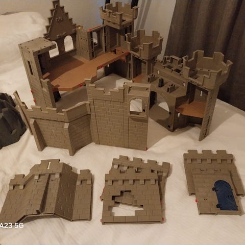 Innefattar ett antal borgar, så endast avhämtning. Det ingår främst det "nya" byggsystemet, men även en del gamla borgbitar, som använts som källare (kan ses på en del av bilderna. Jag vet att lejon-och örnriddarnas slott ingår, men det är många andra byggdelar som ingår. Ingår gör även ett par kilo riddare med vapen, allt från 80-talet fram till idag. Obs, att det är inte 100% att riddarna från borgseten ingår, då jag köpt främst delar från Tradera.