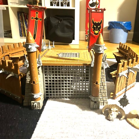 Bilder visar allt som ingår – titta särskilt på bilderna med hela borgen uppbyggd och alla figurer/hästar uppställda.