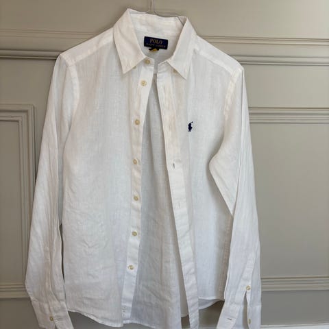 Rosa skjorta med långa ärmar och en broderad logotyp på bröstet. Skjortan har knappar framtill och en klassisk krage. Finns fläck nedtill, se bild.