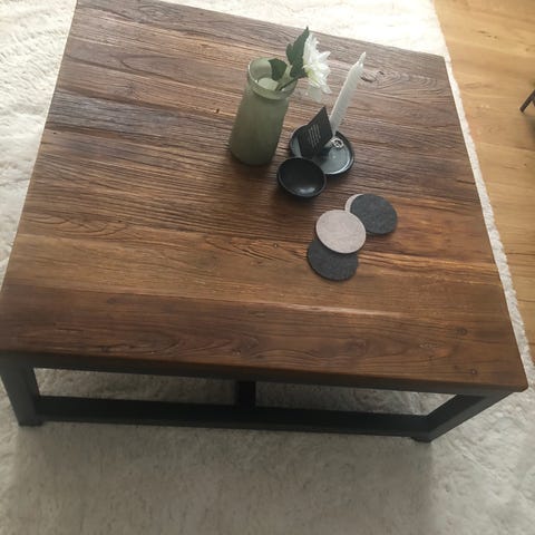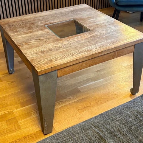 Industriellt soffbord i trä, rustikt med metallhjul.