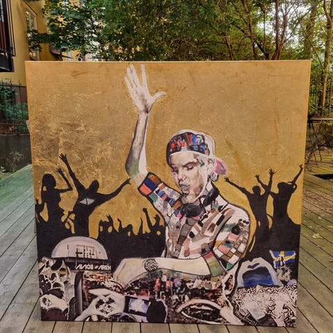 Cirka 70 x 70 cm Akryl eller olja på duk.