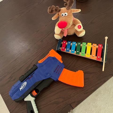 En samling leksakgevär, blasters, med gummiskott. Perfekt julklapp. De kostar flera hundralappar styck i affär. Här finns en låda så att man kan låna ut till vännerna också. Sju små gevär, tre mellanstora och två stora. En väst och en låda med blandade skott. Alla skotten fungerar i alla gevären. En av dem har batterier, övriga luft drivna.