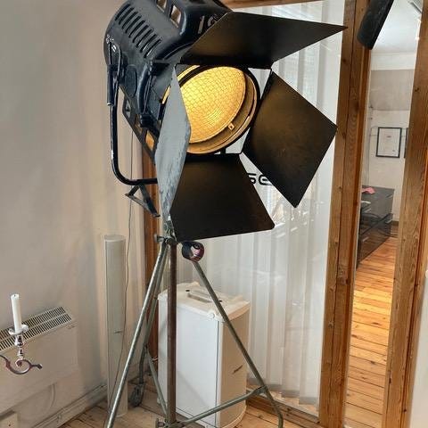 Vintage studiostrålkastare Fototon Femman. Blåmålad aluminium. Höjd ca 85 cm. Se tändsticksasken vid foten för jämförelse. Fresnellinsen är 35 cm i diameter. Strålkastaren är riktbar med viss zoomfunktion. I original 5 Kw, nu konverterad till vanlig glödlampa, sitter en 150 watt nu. Går att återställa helt till original om man skulle vilja. Proveniens Sveriges Television. Tillverkad i Fototons verkstad på Hornsgatan. Spotlight, scenstrålkastare, strålkastare, studiolampa, industridesign. Gärna byte med mitt andra samlarområde, gamla enarmade banditer och spel, -myntautomater oavsett skick.