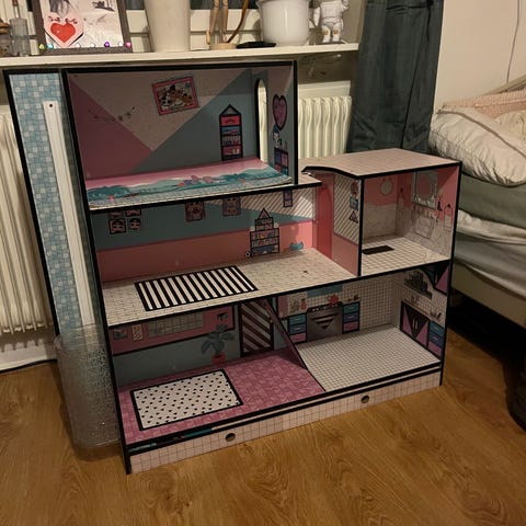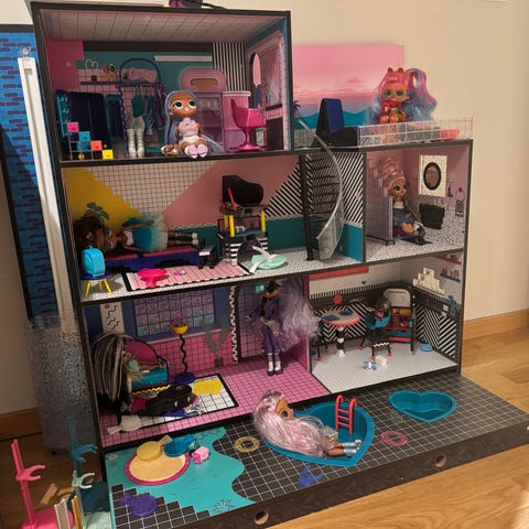 LoL hus som vi förstärkt med träskiva på hjul för ännu bättre lekupplevelse då den är lätt att dra ut mitt i rummet och leka från två håll. Och lika lätt att ställa undan igen. Huset kommer med möbler och tillbehör som mat och köksapparater. Bil, intrument, och flertalet stora och små dockor medföljer i priset.