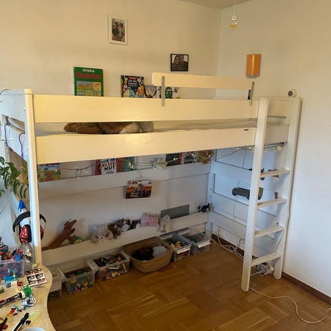 Sängen är i bra skick, inga stora skador, bara ena foten till stegen som är trasig.