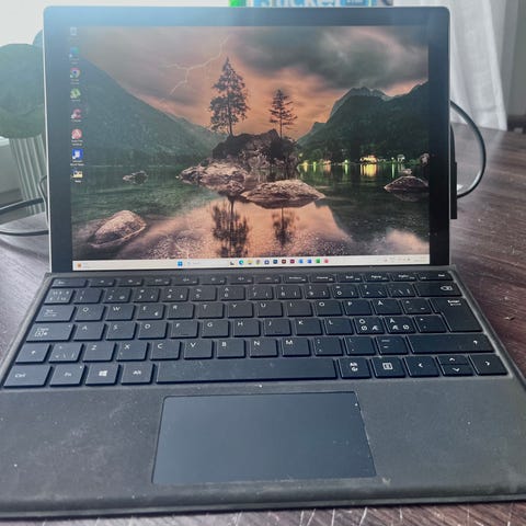 Datorn är i gott skick, förutom en liten buckla på locket (se bild). Skärmen är pekkänslig och Microsoft-pennan ingår.