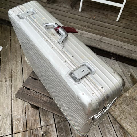 Rimowa klassisk resväska i metall. Resväskan är utrustad med handtag och lås. Insidan är klädd med ett mönstrat tyg och har spännband för att hålla innehållet på plats.