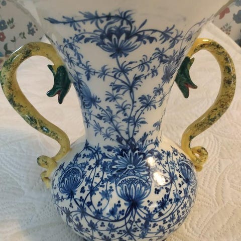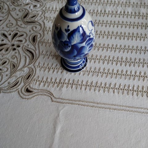Den är 40 cm hög med locket på. Utan locket är den 30 cm hög. Bredden är 20 cm där den är som tjockast. Den är fin och dekorativ. Plus ett trästativ.