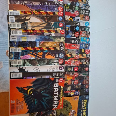 Batman serie serietidningar med olika omslag och berättelser. Innehåller flera nummer med olika teman och karaktärer från Batman-universumet.