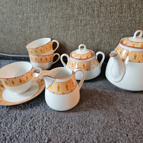 Röd teservis från Sushi Ceramics med tekanna, mjölkkanna och sex koppar.