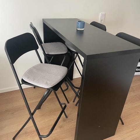 Barbord specialbeställt från Italien med marmor skiva och metallram. Väger väldigt mycket så behövs 2 som bär. Stolarna är från Ellos och kostade 1900 kr st bordet mer än 10 k. Väldigt fint och unikt och bara en i världen ;)