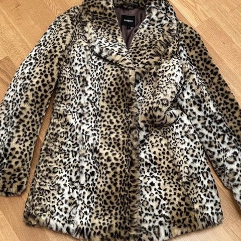 Brun/beige vinterjacka med dragkedja och knappar framtill. Jackan har en huva med fuskpäls och flera fickor fram.