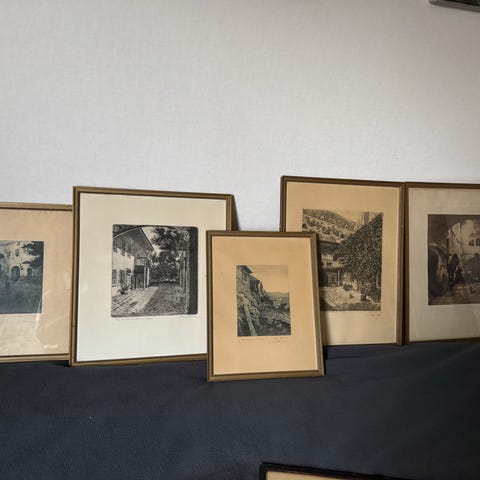 En samling konsttryck och teckningar i olika ramar. Motiven inkluderar en scen med personer vid ett bord under ett tak, en silhuettbild med hundar och en abstrakt porträtteckning.