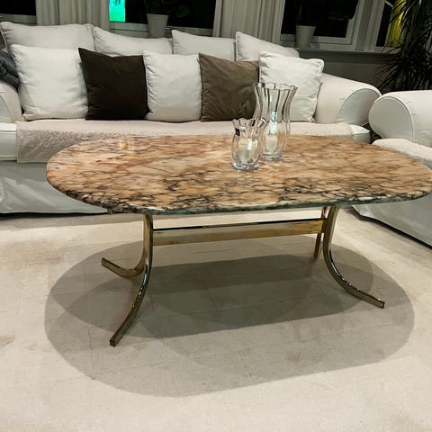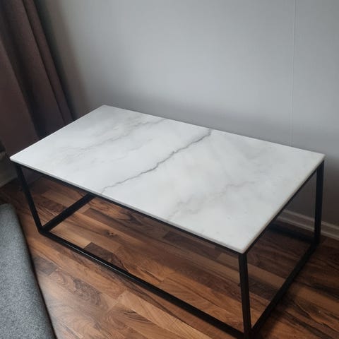 Säljer ett soffbord i stilren design med vit marmorskiva och svart metallstomme.