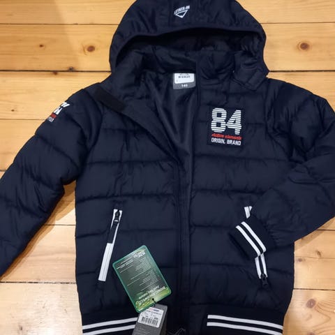Svart jacka i lite längre modell med mjukt foder och huva. Storlek 146. Fint skick!