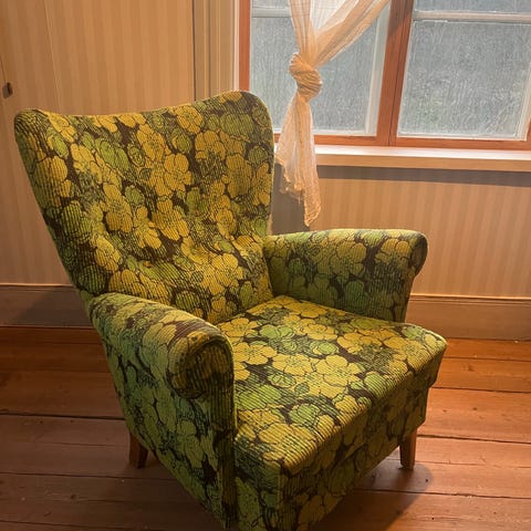 Fåtölj i nyskick designad av möbelmästaren Carl Malmsten för OH Sjögren i Tranås. Fåtöljen "Patronen"