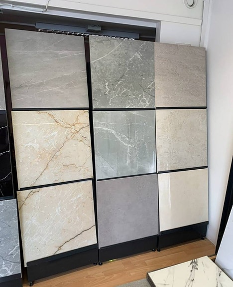 * Bordsskivor: Två rektangulära hyllplan med marmorlook/marmormönster i en ljusgrå/beige nyans. Mönstret har tunna, ljusa ådringar.