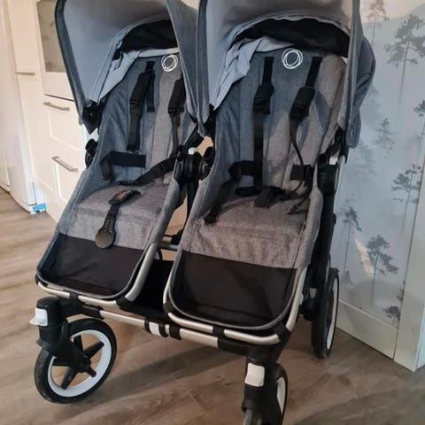 Bugaboo donkey 2 twin. tvillingvagn / syskonvagn. Lite solblekt suflett. Förlängda sufletter. Tvilling vagn så 2 av alla ligg och sittdelar, samt 2 st regnskydd. Kan ha som enkelvagn med varukorg med om bara ett barn är med. Bugaboo Donkey Mono är en monovagn som kan fällas ut till en syskonvagn med endast tre enkla klick. Är ni i starten av att bilda familj, och funderar på att skaffa fler barn i framtiden så är detta vagnen för er. Med en bredd på endast 60 cm i mono-läge och 74 cm bred i syskon- eller tvillingläge tar vagnen sig igenom standarddörrar utan några utmaningar. - Smidig fotbroms - Passar från födsel upp till 4 år - i paketet ingår liggdel och sittdel - Beach-mode - tvåhjulsläge för enkelt strandläge - Duovagn från nyfödd till 22 kg i varje sits (15 kg maxvikt med sits vänd mot förälder i monoutförande) - Bekväm, ergonomisk vändbar sittdel som även har ett liggläge - Enkel att gå och manövrera med en hand - Kompatibel med babyskydd (adapter medföljer) - Sidokorgen som rymmer 18 liter. - Sömlös integration med Bugaboos generella tillbehör Bugaboo Donkey Mono barnvagn är för 1 barn eller För 2 barn. I paketet ingår - Chassi med 4 hjul - 2 sitt/liggdelsramar - 2 ligg- och sittdelsklädsel - Sufflett med breezy-ventilationslucka - Sufflettbågar - Sufflettklämmor - sidokorg (sidoväska för collection) - 2 st Liggdelslock - 2 st regnskydd Nypris 25 000 kr
