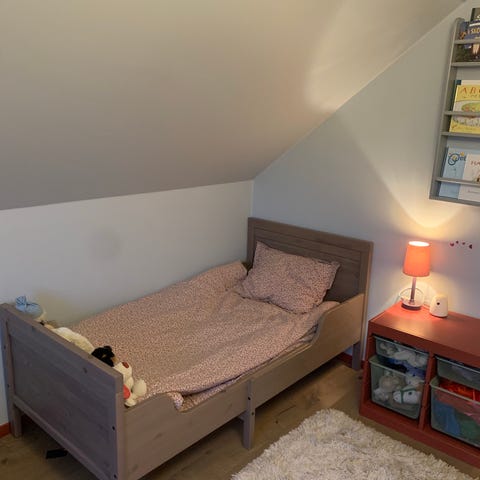 Stabil och smart bebiskrubba/säng på hjul som smidigt går att rulla till det rum man behöver. Vadderad madrass med Polarn O Pyret överdrag. Väl använd men fortfarande i gott skick