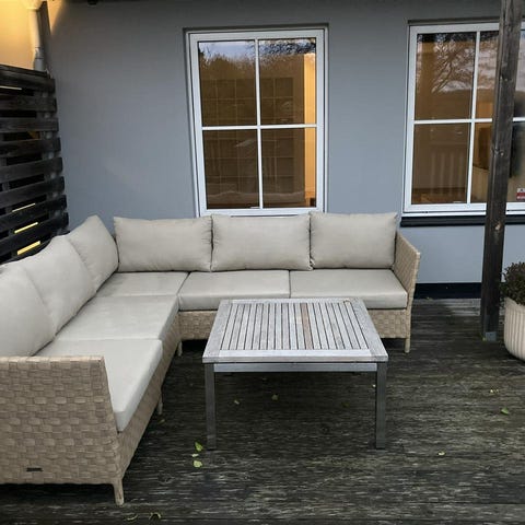 Säljer nu en Grythyttans grupp i teak med galvad stomme och korsade/ kryssade ben på bordet