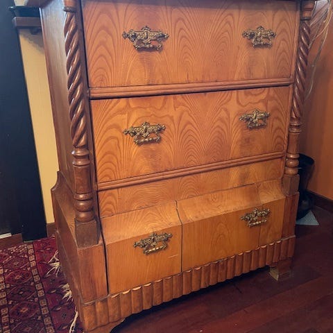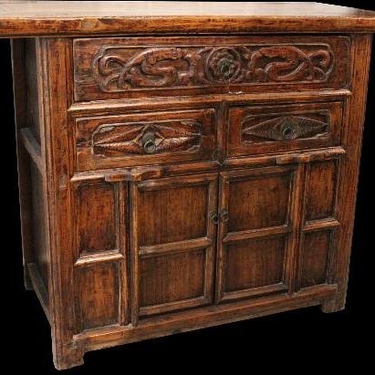 Antik träbyrå med handgjorda snidade detaljer på fronten. Byrån har en mörk träfinish och är tillverkad av massivt trä. Passar som t ex TV bänk/Hallmöbel.