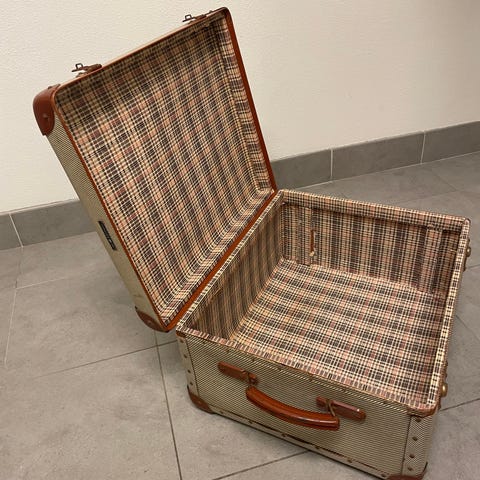 60-tals väska som målats och dekorerats av mig. Unik i sitt slag 40x 30. Djup 14 cm Hämtas i Salabackar Uppsala Skickas ej