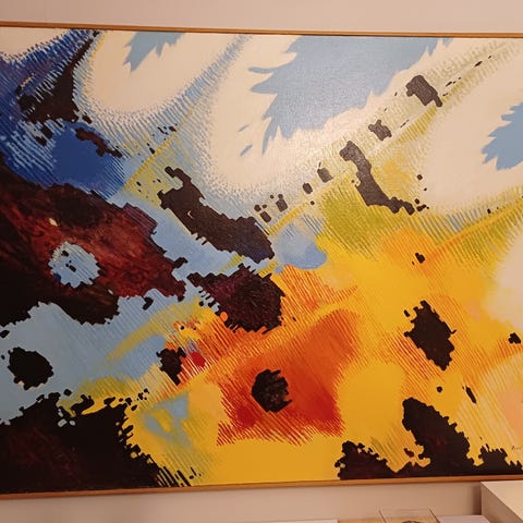 Tavĺa.Signerat Lena Larsson 1991. Målning på pannå. Mått 68 x 78 cm. Signed Lena Larsson 1991. Painting on panel. Dimensions 68 x 78 cm.