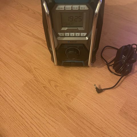 Makita arbetsradio äldre modellen. AUX-ingång. LCD-display. FM-antenn. Ingen Bluetooth. Utan batteri. Bakre kåpa saknas.