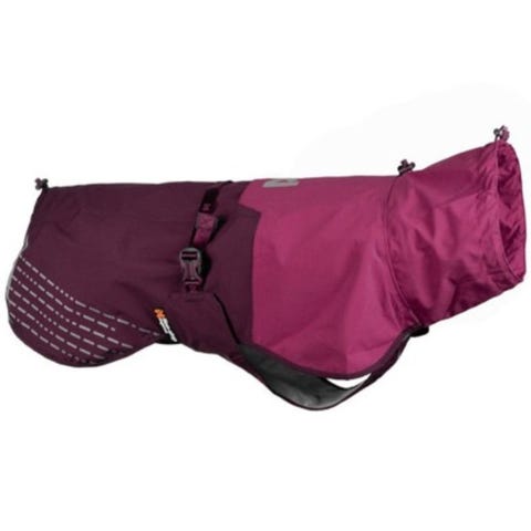 Lång krage skyddar mot regn i nacken och på benen finns resår med kardborreband som smiter åt ovanför tassarna.