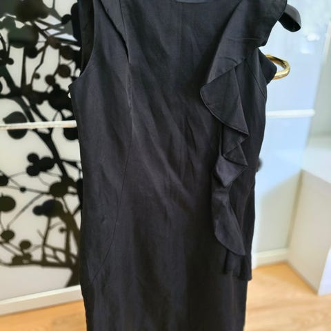 Mycket fin och elegant svart klänning från LOFT med volangdetalj nedtill, storlek 38. Klänningen har en rund halsringning, en liten öppning baktill och dragkedja på sidan, se bild. Perfekt för både vardag och fest. Längd 83cm, se bild.