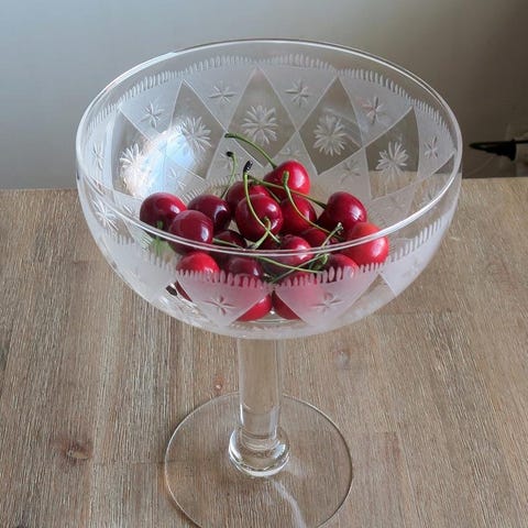 Äldre kakfat, fruktfat på fot, kristall. En del smånagg på kanterna men inte så påtagliga. Höjd 21,5 cm. Diameter 23,5 cm. 200:-. Skickas ej, kan hämtas i Helsingborg.