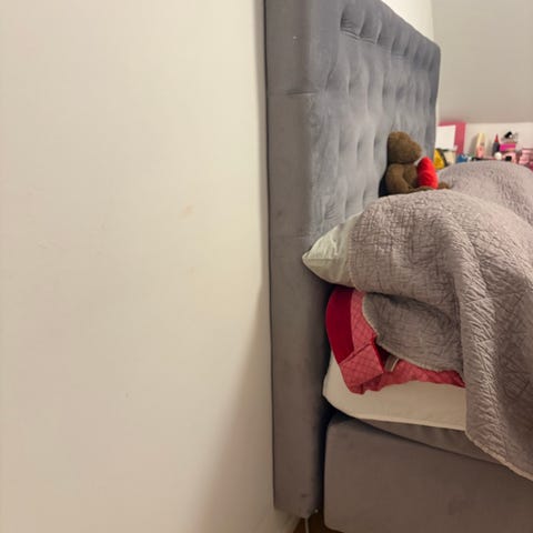 En fin sänggavel med beige sammetstyg och spegelglas med silverdetaljer. Obs! Den väger 65 kg så ta med bärhjälp. Finns i Partille C. Hiss finns i huset.