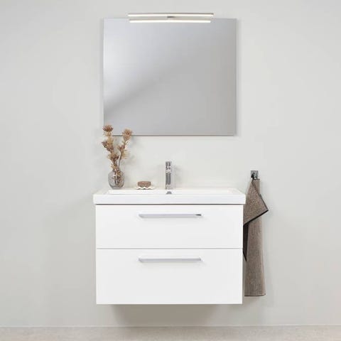 Komplett badrumspaket med kommod, tvättställ och spegelskåp.