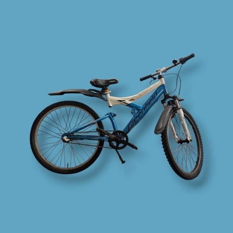 Monark Wrangel i blått. Använd men i fint skick med vissa rostiga detaljer. Har 6 växlar (siffrorna syns ej). Däckbredd 4 cm, lägsta sadelhöjd ca 80 cm.