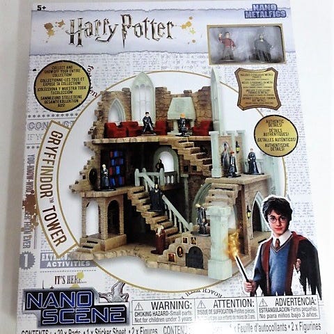 Gryffindor Tower och 20 Nano metallfigurer av flertalet Harry Potter karaktärer varav två exklusiva figurer (Harry Potter och professor Snape.) Slottet har noggrant utformade detaljer som bokhyllor, målningar och möbler samt två öppningsbara dörrar.
