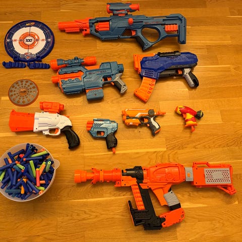 Olika modeller och märken kolla bilderna. Men flera original NERF.