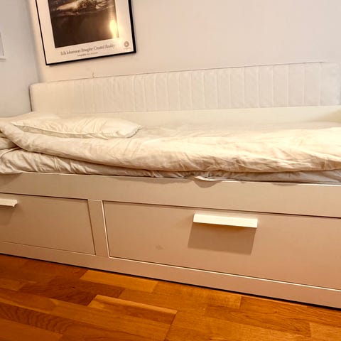 Säng med utdragbar extrasäng 2x90 cm madrasser ingår om man vill. Ta med bärhjälp då jag inte kan lyfta tungt ingen hiss.
