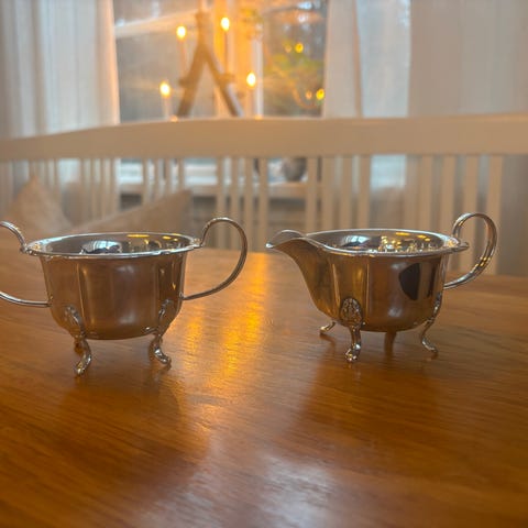 Ett elegant set från Ullaskruf, bestående av en gräddkanna och en sockerskål med tillhörande bricka. Alla delar har en fin gulddetalj.