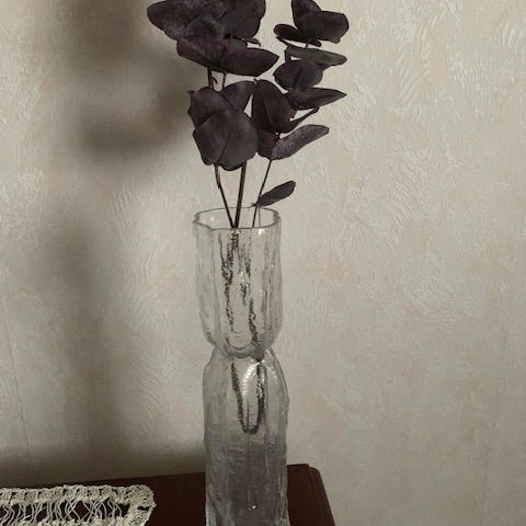 En ovanlig modell ”hattvas” i glas signerad av Finn Schjöll, Hadeland. Kan användas exempelvis för tulpaner alternativt som skål. Mått: 20,5 cm bred upptill, 15 cm i botten och 15 cm hög.
