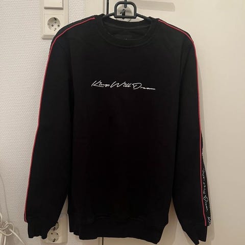 Röd sweatshirt från KWD i strl XS med svarta och vita detaljer längs ärmarna och tryck på bröstet. Baksidan har stora svarta ränder och text. Perfekt för en streetwear-look. Tröjan är bara använd 1 gång.