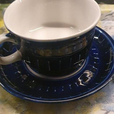 Retro kaffekopp i mycket gott skick. Design: Inkeri Seppälä Koppens diameter: 7,7 cm Underfatets diameter: 15 cm Koppens höjd: 6 cm.