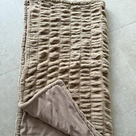 Grå fuskpäls, tyg, aldrig använd, bredd 56 cm, längd 1,90 m. Nypris 325:-.