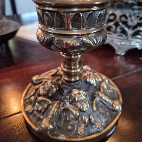 Äldre ljusstake i gjuten metall, troligen tenn- eller zinkblandning