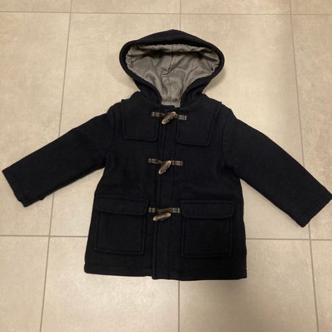 Jättefin duffeljacka. Storlek 98 (2-3 år). Avtagbar huva, go mjuk ribbning vid ärmsluten och vid halsen, blixtlås + knäppen. Yttermaterialet är 80% ull och 20% nylon. Bra fickor. Kan skickas mot port. Djur- och rökfritt hem.