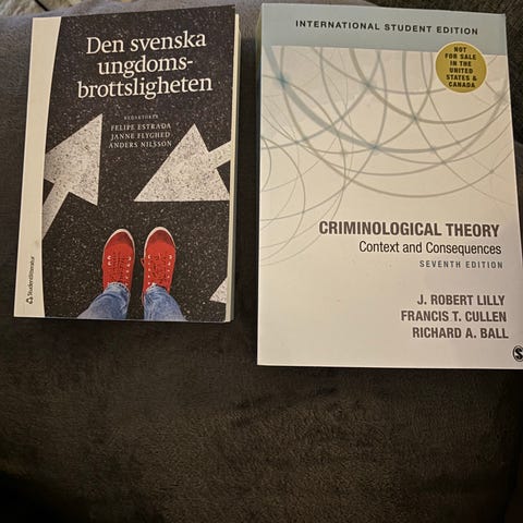 Säljer min Criminology kurslitteratur bok i bra skick, den är lite böjd i kanterna och en liten reva på sidan. Men annars fin