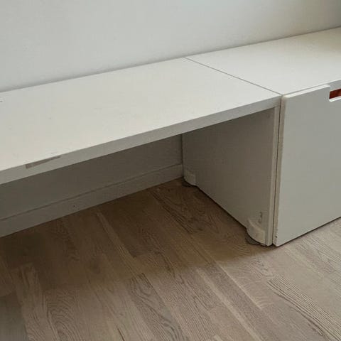 Hylla i brunt trä har storleken 30*83 cm och de vita stöden är 17 cm höga.