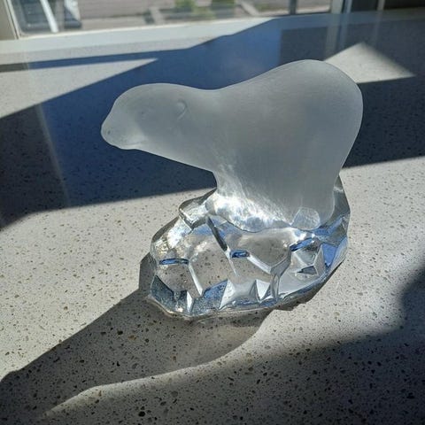 Vacker munblåst glaskaraff i klart glas. Karaffen har en droppformad kropp, en smal hals och två öppningar – en upptill med dekorativ glaskula i kork och en på sidan med plan korkpropp. Höjd cirka 22 cm. Glaset har naturliga bubblor och ojämnheter från tillverkningen.
