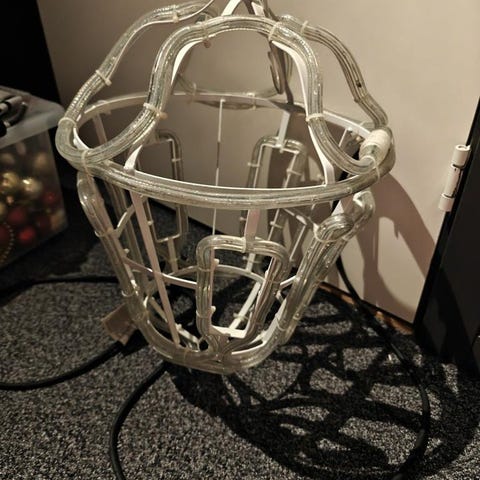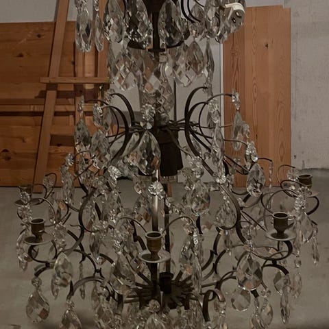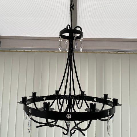 Ljuskrona i metall med plats för 8 ljus och tillhörande kedja för upphängning. Endast avhämtning.