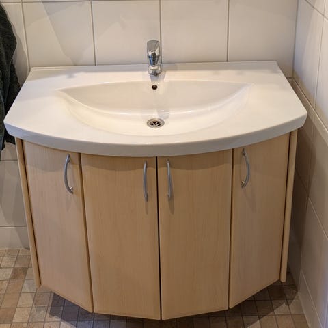 Badrumsinredning ca 5 år. Vasken o spegeln ser ut som nya. Men skåpet under vasken märks att det stått i ett badrum i 5 år och ena dörren kärvar lite. Spegeln är 80 cm bredd och 105 cm hög. Vasken är som mest 87 cm bredd på ovansidan medan underskåpet är 83 cm bredd. Totalt är det 85 cm högt. Vasken är som mest 50 cm djup där handfatet sticker ut men normalt 37 cm djupt. Kan tranporteras
